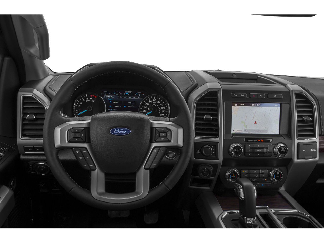 - Includes vehicle with standard equipment, BLIS (Blind Spot Information System) with Cross-Traffic Alert (BLIS sensor in LED taillamp), remote start system, remote tailgate release, reverse sensing system, quad beam LED headlamps and LED taillamps, automatic high beam lights with rain-sensing windshield wipers, heated windshield wiper park, LED fog lamps, LED side mirror spotlights, power folding, power glass side view mirrors with heat, turn signals, memory, auto-dimming feature on drivers side, high-intensity LED security approach lamps, one 110V/400W outlet (two with bucket seats), universal garage door opener, power tilt and telescoping steering column with memory, heated steering wheel, heated and cooled leather-trimmed bucket seats, 10-way power driver and passenger seats, memory driver seat, heated second row seats, flow-through console with floor shift, B&O PLAY Premium single-CD player, HD radio, SYNC Connect (door lock and unlock, schedule specific time for remote start, locate parked vehicle, and check vehicle status using compatible smart phone), SiriusXM Satellite Radio, voice-activated touchscreen navigation with pinch to zoom capability, SiriusXM Traffic and Travel Link with five years of service in the 48 contiguous United States and D.C., and Lariat Chrome Appearance Package including 18 inch chrome-like PVD wheels, 275/65R18 OWL all-terrain tires, chrome angular step bars, chrome door handles with body-color bezel, two chrome front tow hooks, chrome single-tip exhaust, chrome skull caps on exterior mirrors, and chrome three-bar style grille with chrome surround and chrome mesh insert. When Two-Tone Paint is selected, front and rear chrome bumpers are replaced with front and rear accent-color bumpers, and standard body-color wheel lip moldings are replaced with accent-color wheel lip moldings.